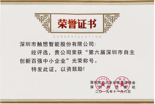 重磅喜訊 | 觸想智能榮獲“深圳市自主創新百強中小企業”稱號