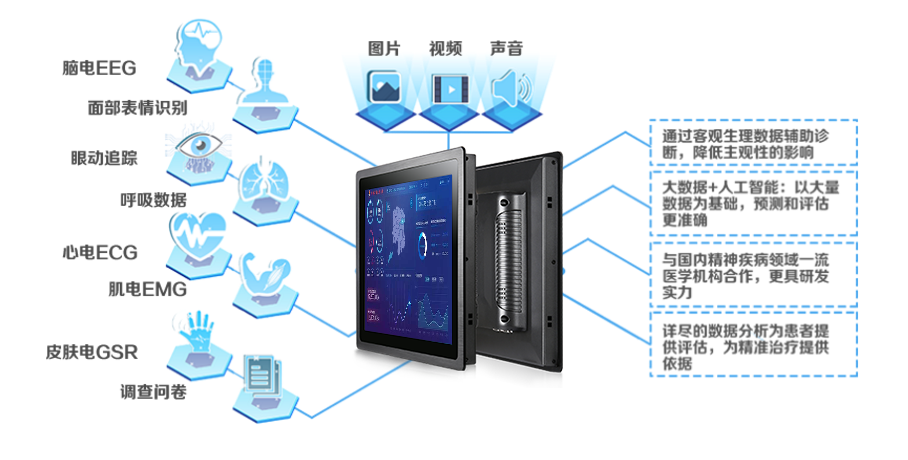 AI評(píng)估系統(tǒng)中應(yīng)用工業(yè)顯示器,通過顯示器所收集患者的腦電EEG、面部表情識(shí)別信息、眼動(dòng)追蹤、呼吸數(shù)據(jù)、肌電EMG,皮膚電GSR等相關(guān)數(shù)據(jù),以客觀生理數(shù)據(jù)輔助診斷,大大降低了傳統(tǒng)心理治療中,不可避免的主觀因素影響。