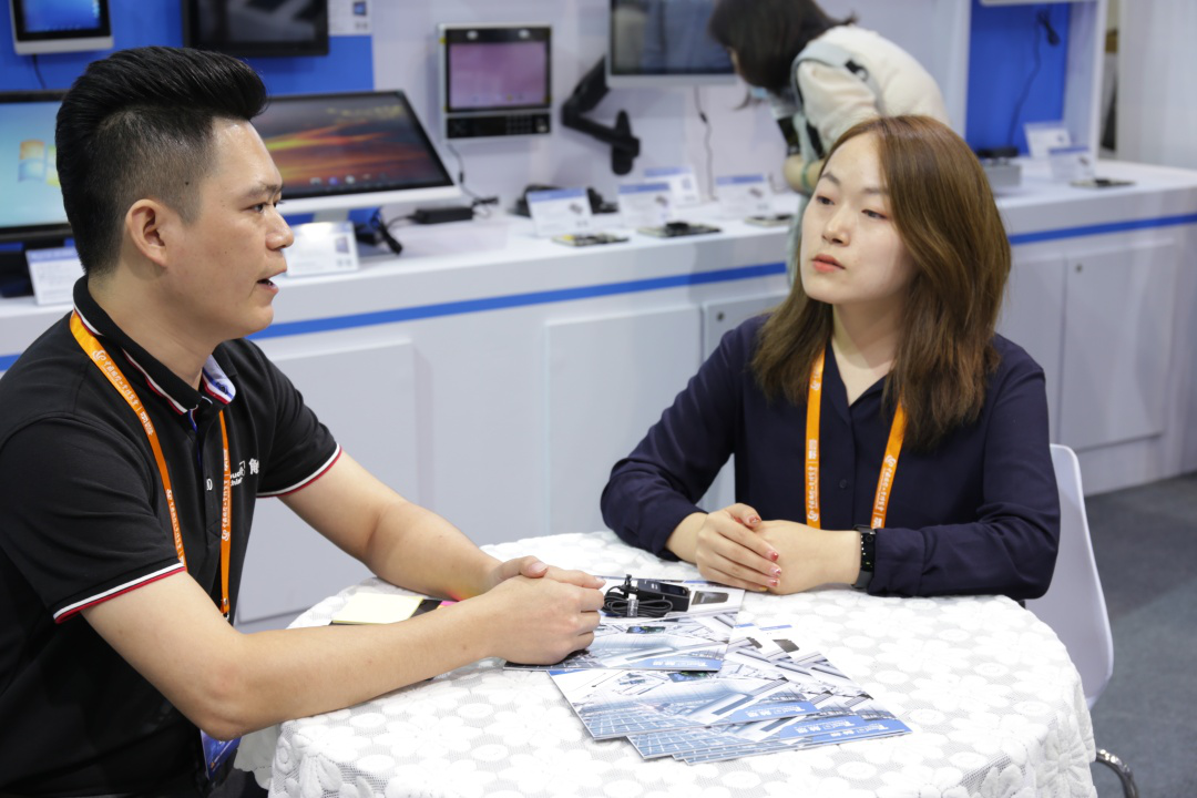 我們的小哥正在向參展觀眾介紹觸想的產(chǎn)品。